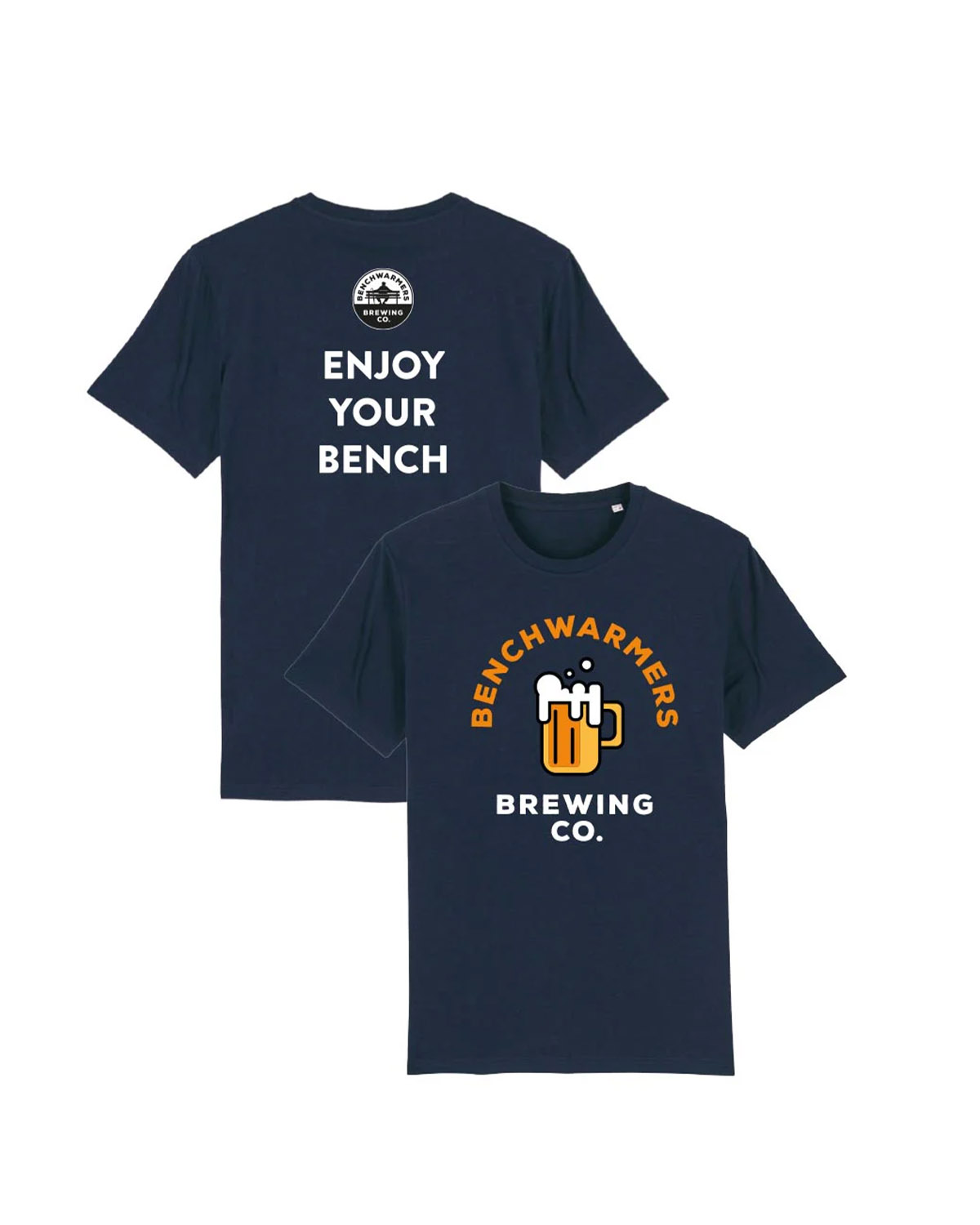 Navy t-shirt från fantastiska Benchwarmers Brewing Co. Tryck både fram och bak.