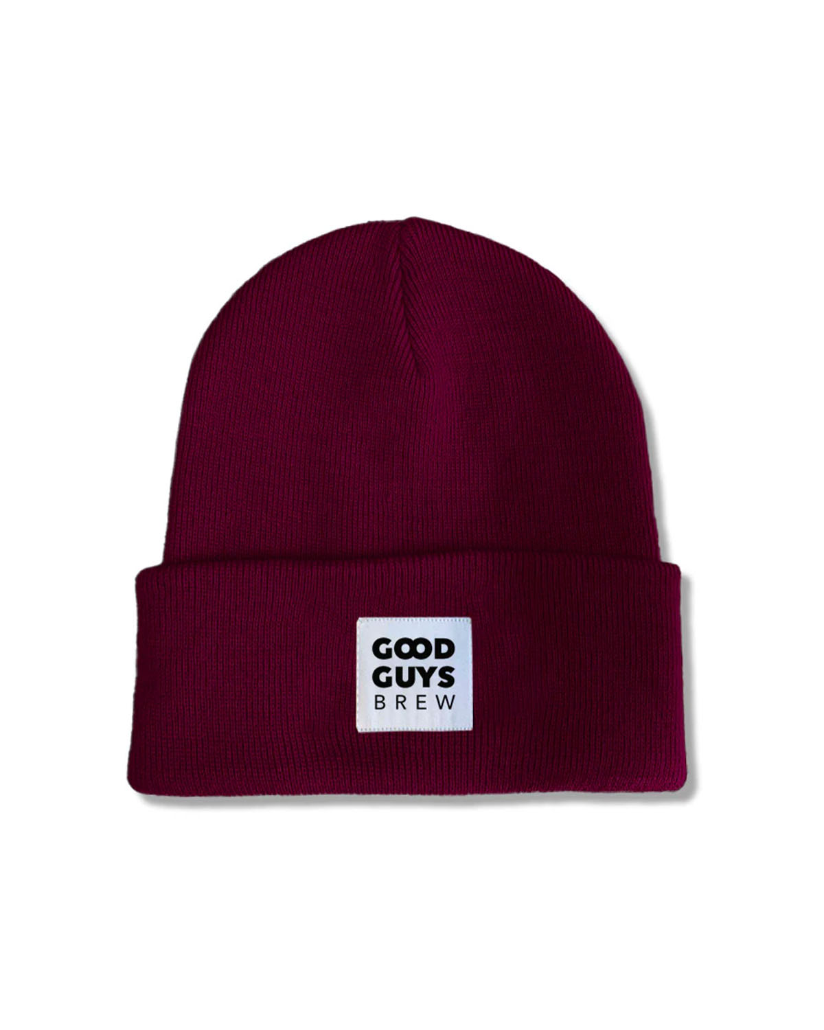 Vinröd beanie från Good Guys Brew. Vävd etikett på fronten med svart logga.