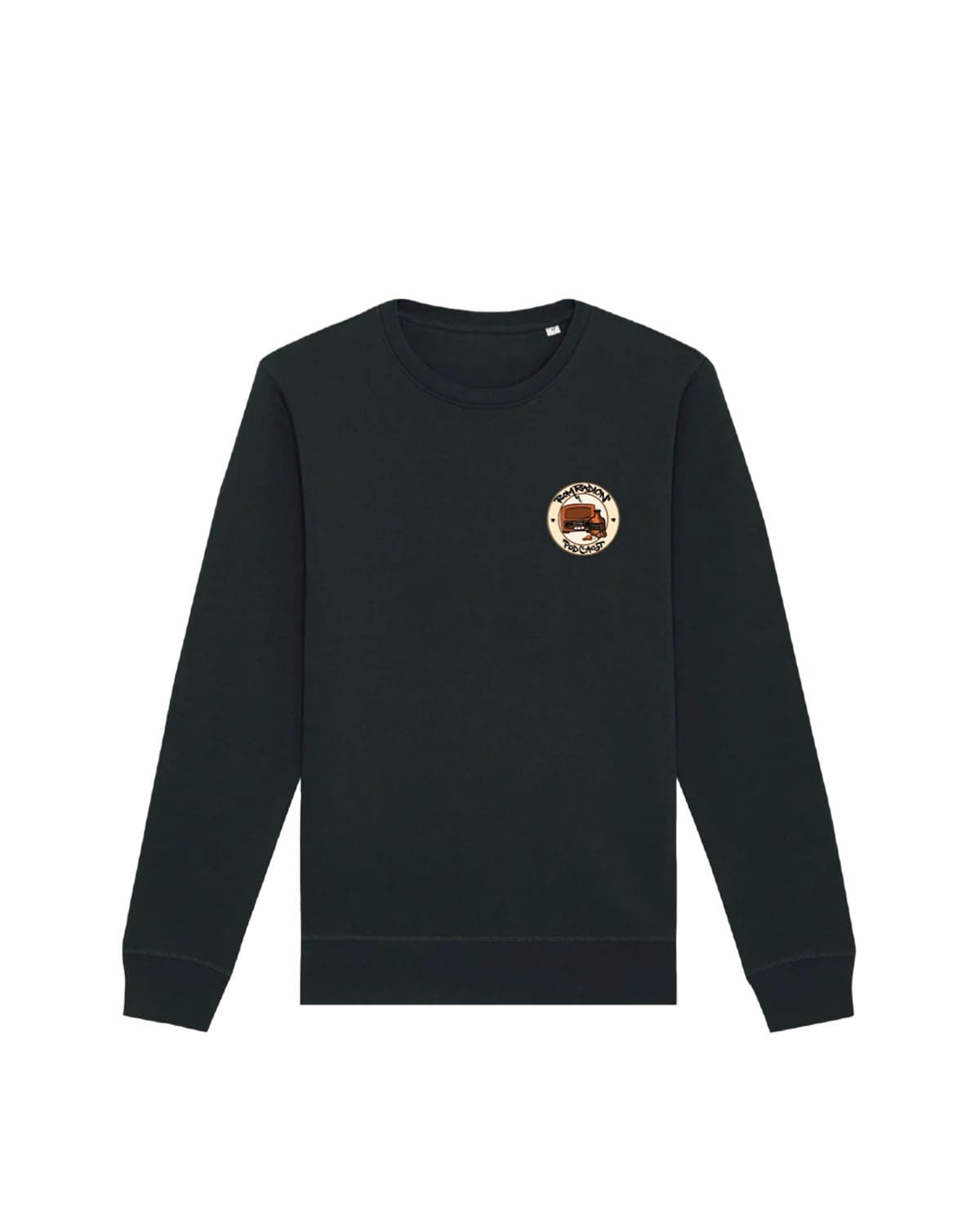 Svart sweatshirt med Romradions logo tryckt över vänster bröst.