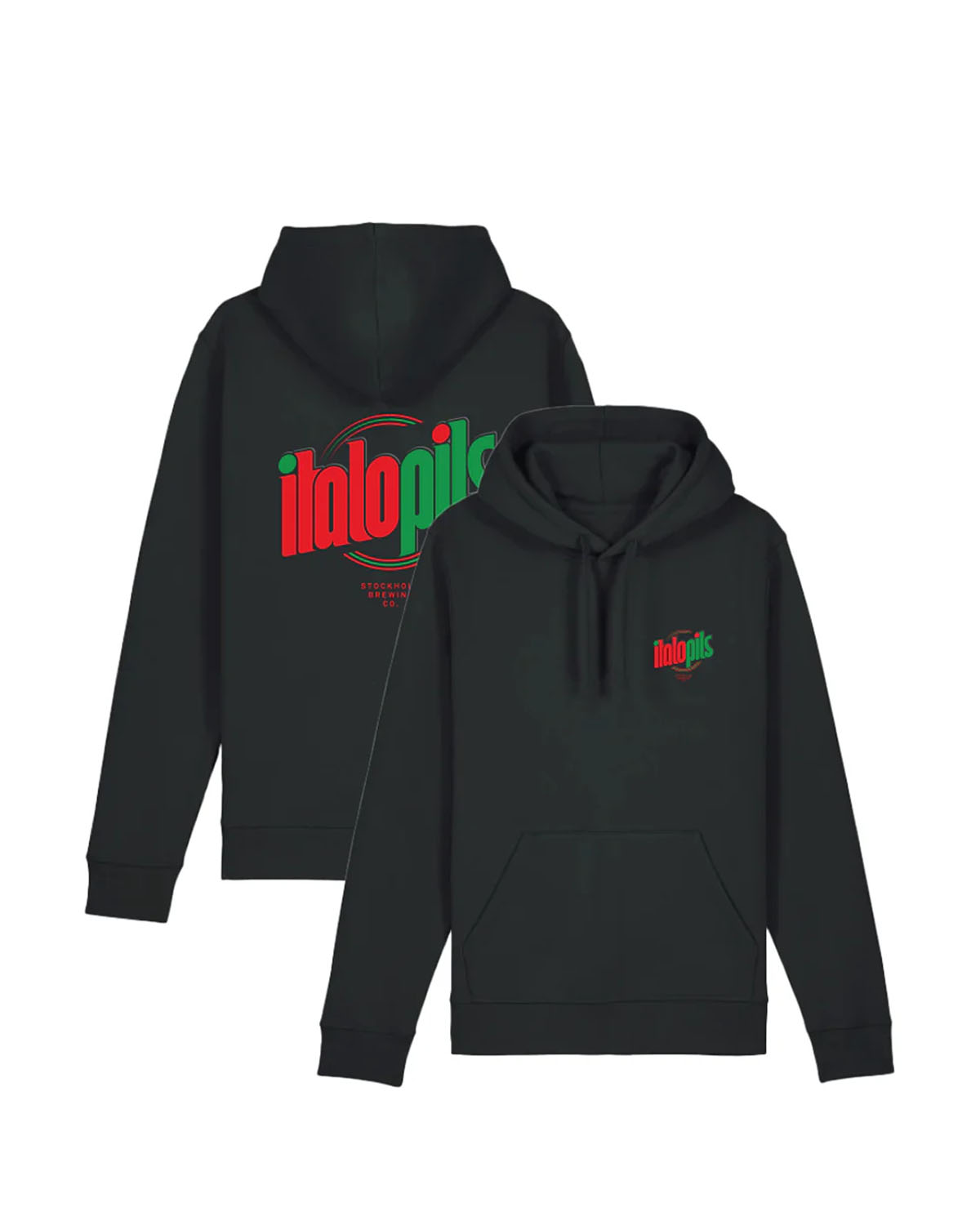 Hoodie från Stockholm Brewing Co med Italopils tryck både fram och bak.